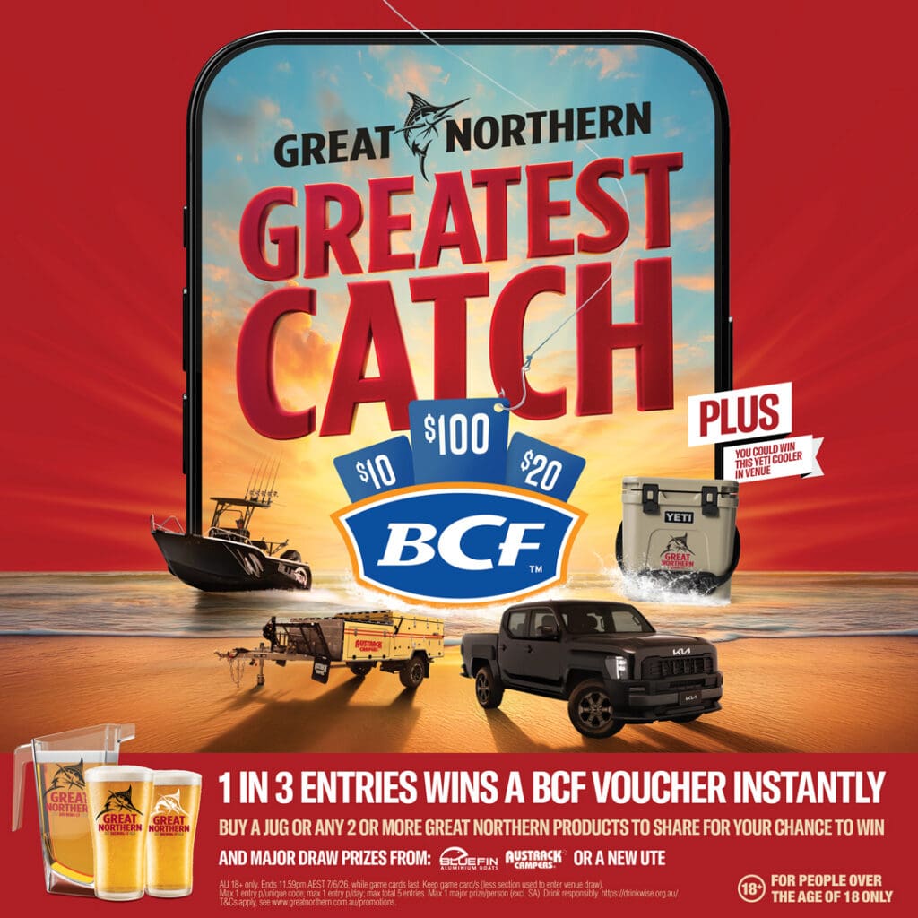 AU 18+ only. Ends 11:59pm AEST 07/06/2026. Keep game card/s (less section used to enter venue draw). Max 1 entry p/unique code; max 1 entry p/day; max total 5 entries. Max 1 major prize/person (excl. SA). Drink responsibly. https://drinkwise.org.au/. T&Cs apply, see www.greatnorthern.com.au/promotions.