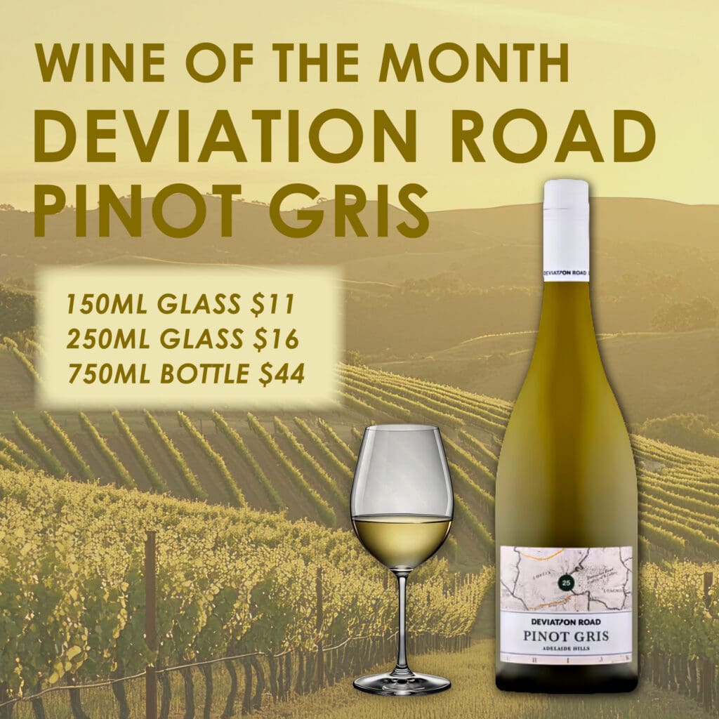 This one is best enjoyed chatting with mates, wine in hand! How about a glass of Deviation Road Pinot Gris for $8?